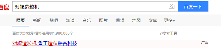 在百度上搜索“對輥造粒機”這個關鍵詞的顯示結果:排在_位的是廣告標志的其他公司,但不是我們衡水隆昌肥料造粒機械有限公司的官方網站。