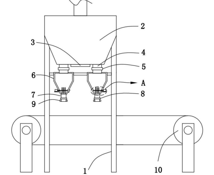 物料由料倉通過閘板閥進入重力給料裝置,再經過給料器給料,進入稱重計量裝置,通過與稱重料倉相連的稱重傳感器的稱重儀表發(fā)出重量變化信號,并由稱重儀表根據預定值控制給料裝置的關閉。當稱量結束后稱量斗門打開,物料經過緩沖充料斗進入夾袋機構上的空袋中。等待所有物料落入口袋后,儀表判穩(wěn),累計后,自動松袋,口袋落入輸送機。輸送機將稱重完成口袋輸送至縫紉機處,操作工將口袋整理至縫紉機處縫包,輸送機將封口后的成品袋送至碼垛處碼垛,至此一套工序完成,如繼續(xù)循環(huán)即可。
